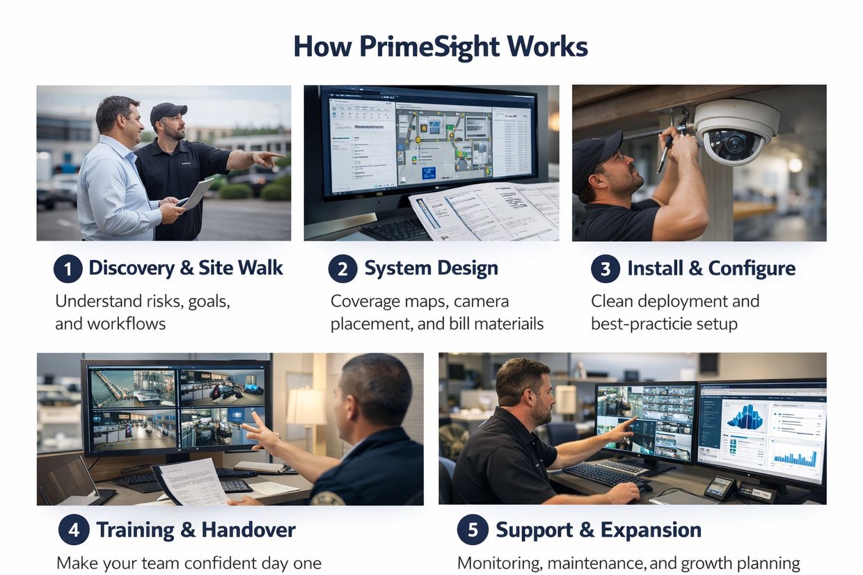 At Prime Sight Systems, we specialize in providing tailored security solutions for businesses of all sizes. Our team of experts will work with you to identify potential security threats and design a custom solution that meets your specific needs. From video surveillance and access control systems to alarm monitoring and fire protection, we have the expertise to keep your business safe and secure. Our team of licensed and insured technicians provides exceptional service and support, ensuring that your security system is always functioning at its best.